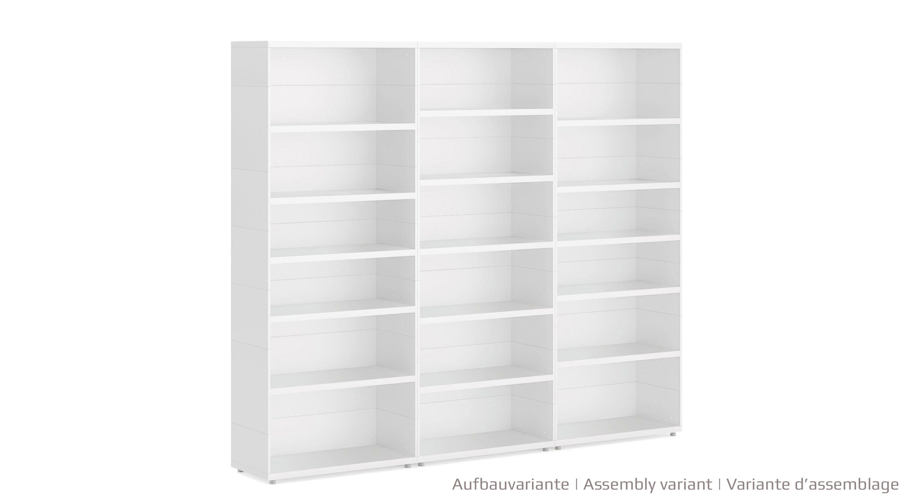 Hochwertige modulare Regalwand für Wohnzimmer, Office oder Laden mit unterschiedlichen Regalfachhöhen von 22 cm, 27 cm und 33 cm schafft Platz für CDs, Bücher und Ordner.