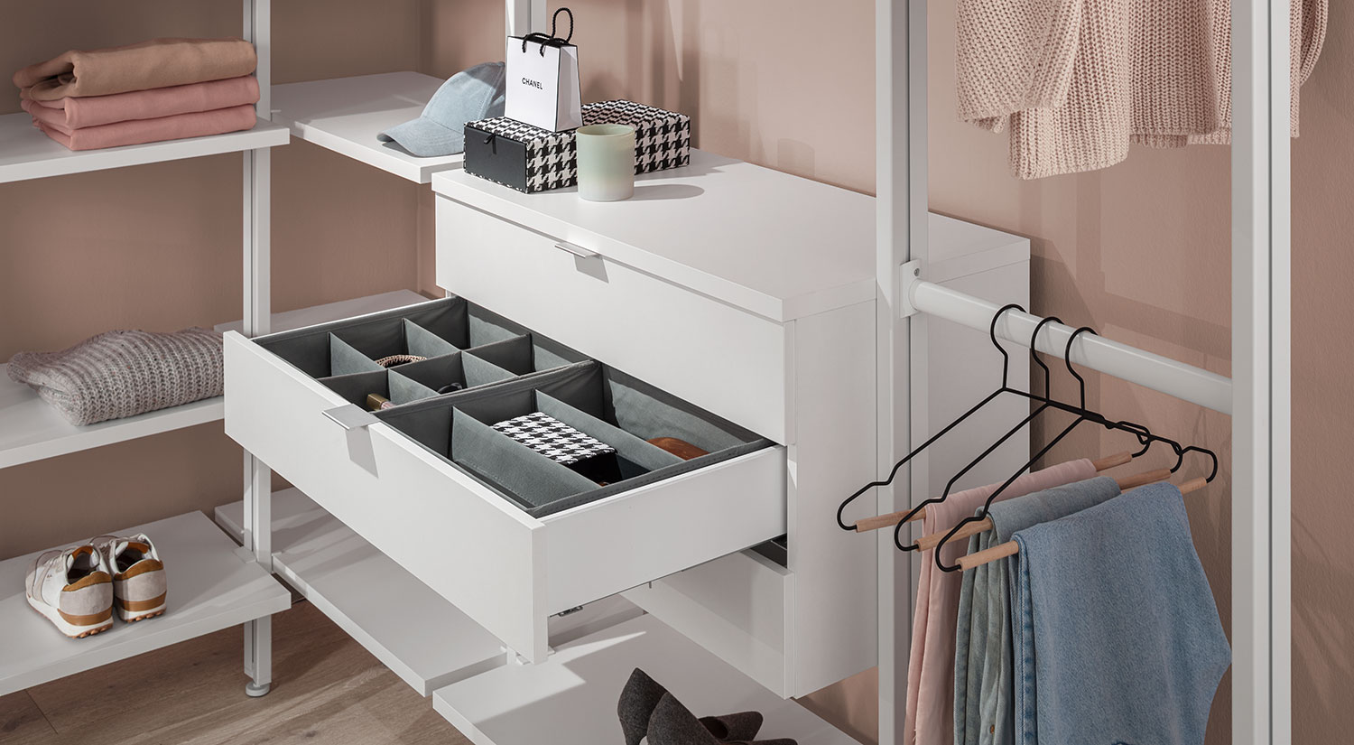 Dank der praktischen Schubladeneinsätze heißt es jetzt auch für Schubladen: Ordnung statt Chaos. Denn sie sorgen für den nötigen Überblick in Schubladen, trennen Unterwäsche von Socken und bieten auch noch Platz für Gürtel oder Krawatten. Die Ordnungsboxen gibt es mit drei oder sechs Fächern und in schönem Stoff oder praktischem Vlies. Beide Einsätze passen perfekt in die Schubladenelemente unserer Sideboards von CLOS-IT und WALK-IN und sind so konzipiert, dass zwei Einsätze nebeneinander Platz finden.