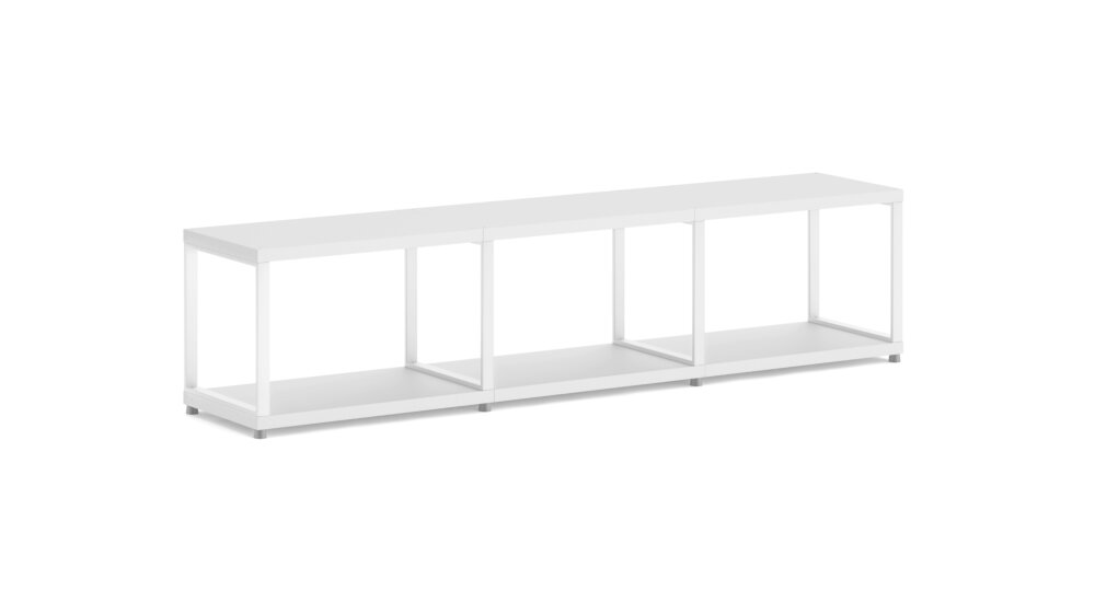 Modulares und belastbares Regalsystem mit rechteckigen Fächern und offenen Seitenrahmen. Schwere Bücher, gewichtige Ordner und schöne Deko finden hier das perfekte Zuhause.