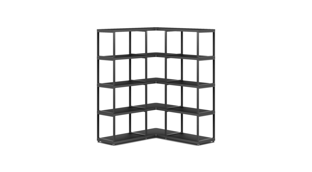 Modulares Eckregal für Zuhause + Büro mit rechteckigen Fächern sowie offenen Seitenrahmen. Es findet sogar unter Dachschrägen und Treppen Platz und schafft zusätzlichen Stauraum.