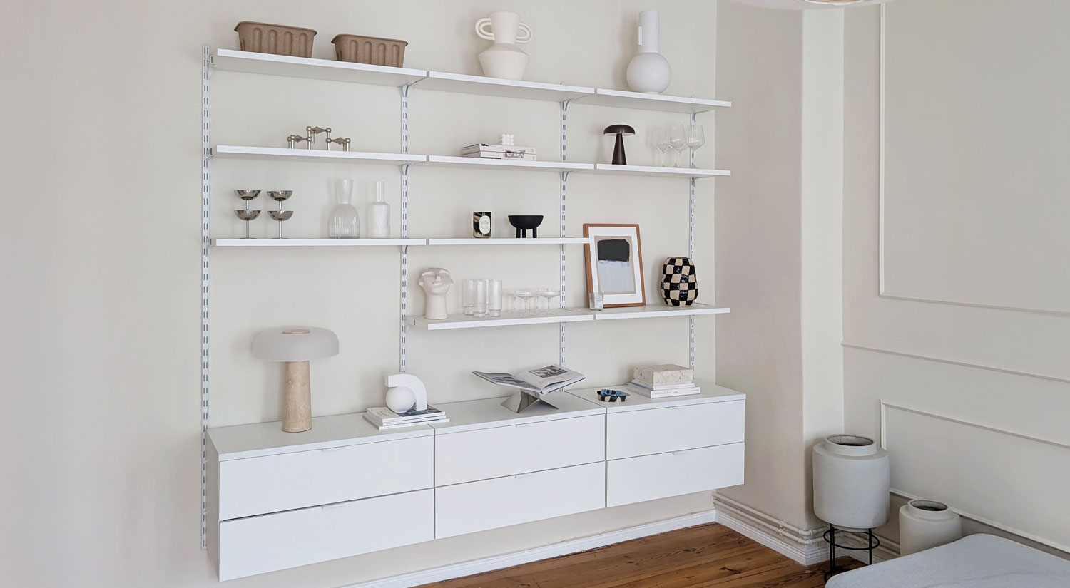Regal weiß - ON-WALL weisses Wandschienen Regal im Wohnzimmer