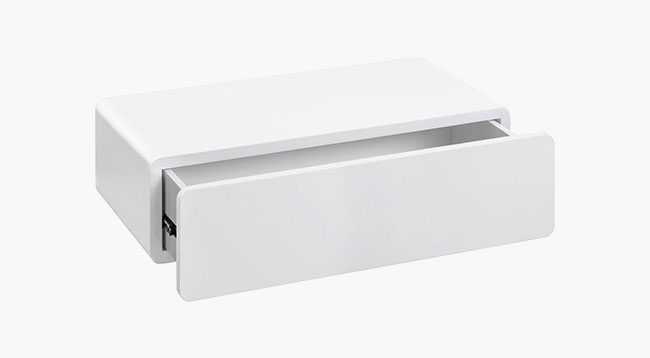 Charakteristisch für das Wandregal mit Schublade CASSY sind die abgerundeten Ecken, die ein besonders harmonisches Raumgefühl schaffen. Im Schlafzimmer ist es als hängender Nachttisch eine moderne Alternative zum klassischen Nachttisch. Neben seinem Design punktet CASSY mit einer hohen Vollauszugsschublade. Dadurch ist es noch komfortabler und bietet mehr geschlossenen Stauraum als CASSETO. Bei der Wandbefestigung ist Präzision nötig. Sind die Bohrlöcher gesetzt, ist kein Nachjustieren mehr möglich. Die Wandschublade ist mit bis zu 15 kg belastbar.