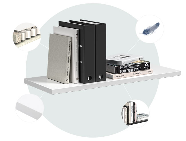 Die ON-WALL Regalböden in den Standardgrößen zeichnen sich durch ihre innovative Wabenkerntechnologie aus, die für eine außergewöhnlich hohe Stabilität sorgt. Dieser Wabenkern wird äußerst ressourcenschonend aus Recyclingpapier hergestellt. Mit einer Bodenstärke von 2,5 cm verbinden sie höchste Qualität mit elegantem Design und edler Kantenoptik.