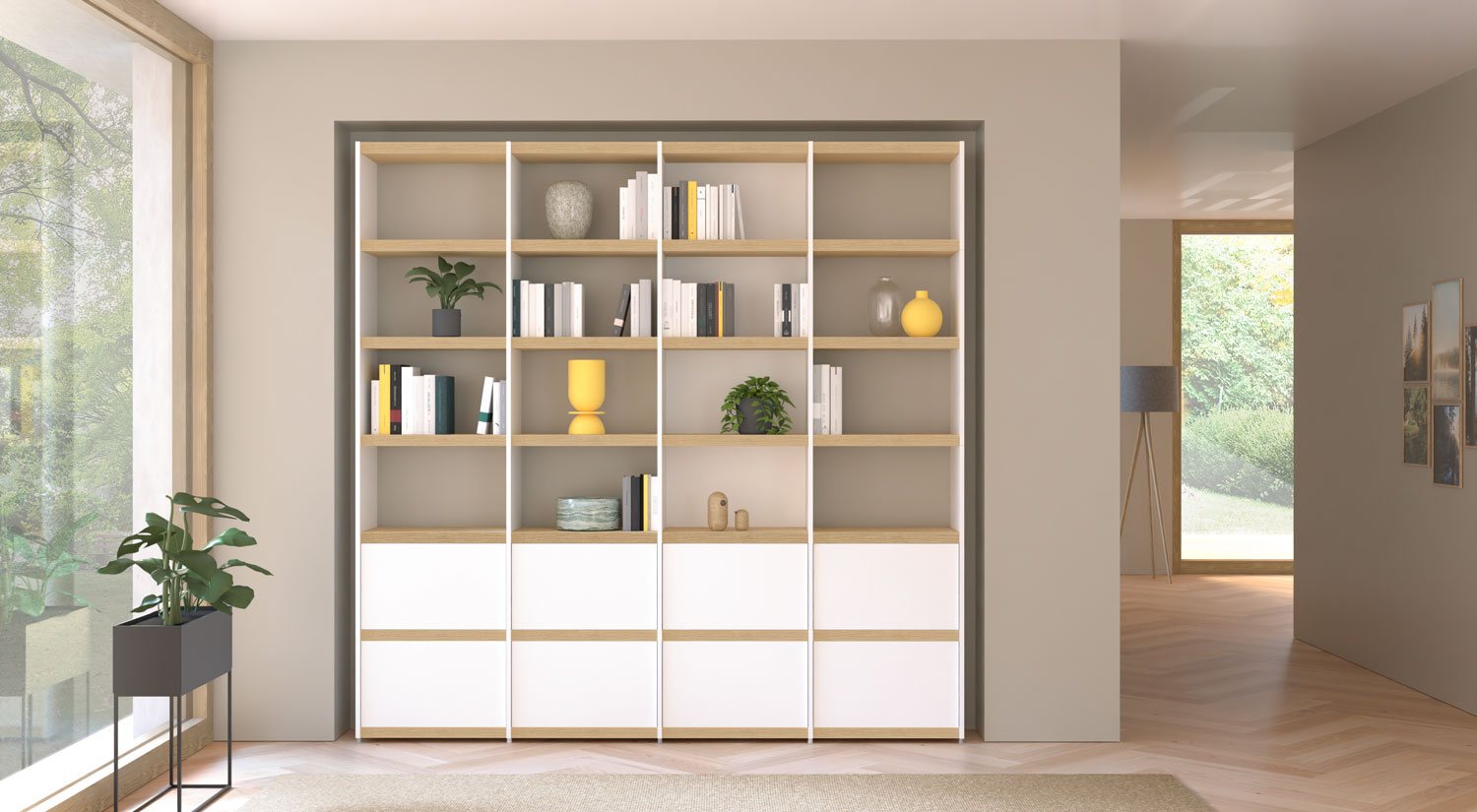 Bücherregal weiß mit XL-Türen BOON Regalsystem im Wohnzimmer