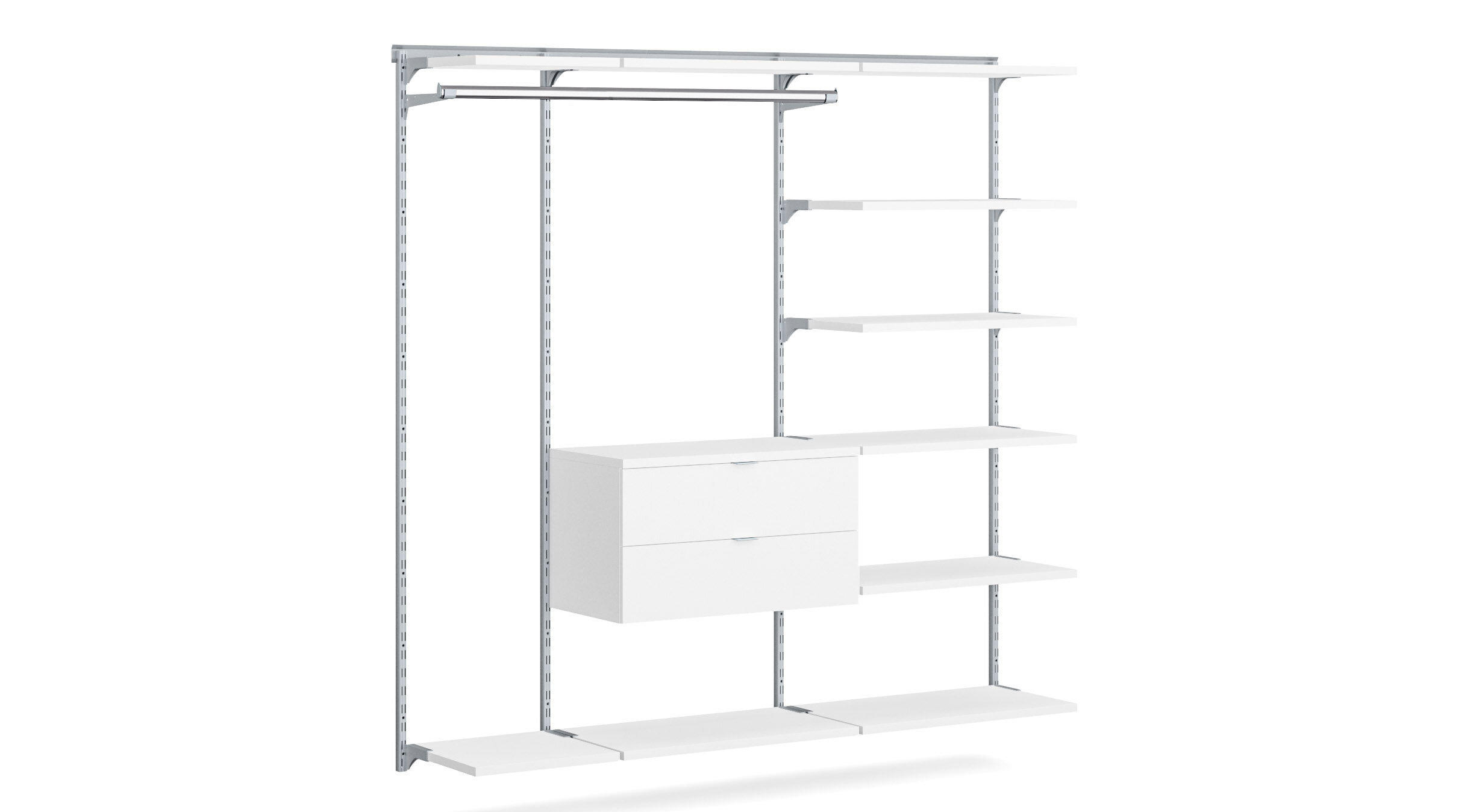 Klassisches Regalsystem für Kleiderschrank und Garderobe mit Hängeschienen + Trägern aus Stahl, Regalböden, Kleiderstangen sowie Schubladen.