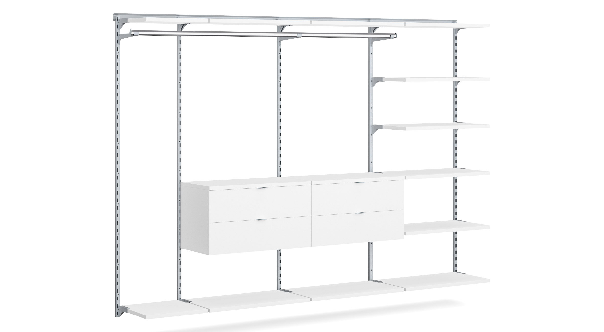 Klassisches Regalsystem für Kleiderschrank und Garderobe mit Hängeschienen + Trägern aus Stahl, Regalböden, Kleiderstangen sowie Schubladen.