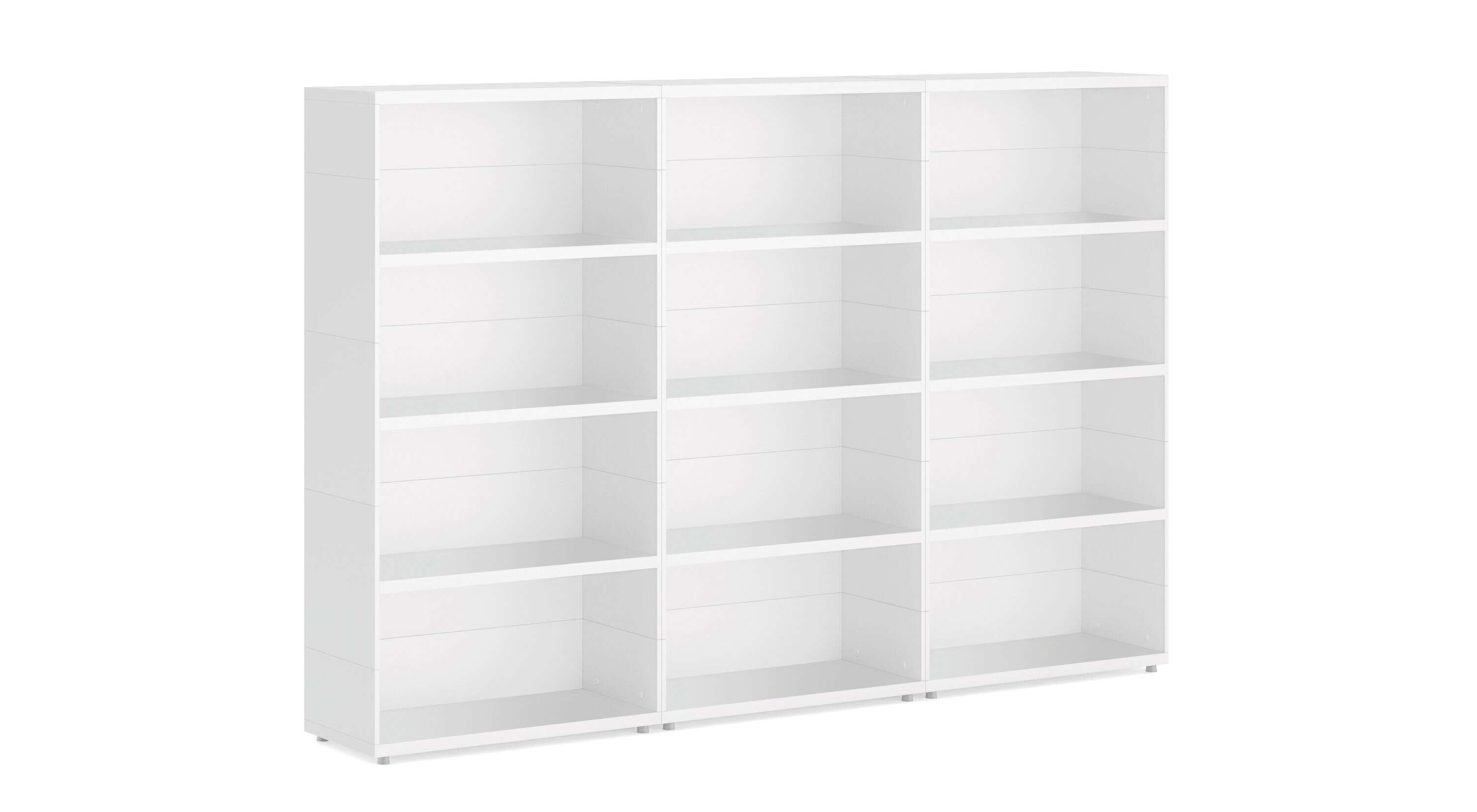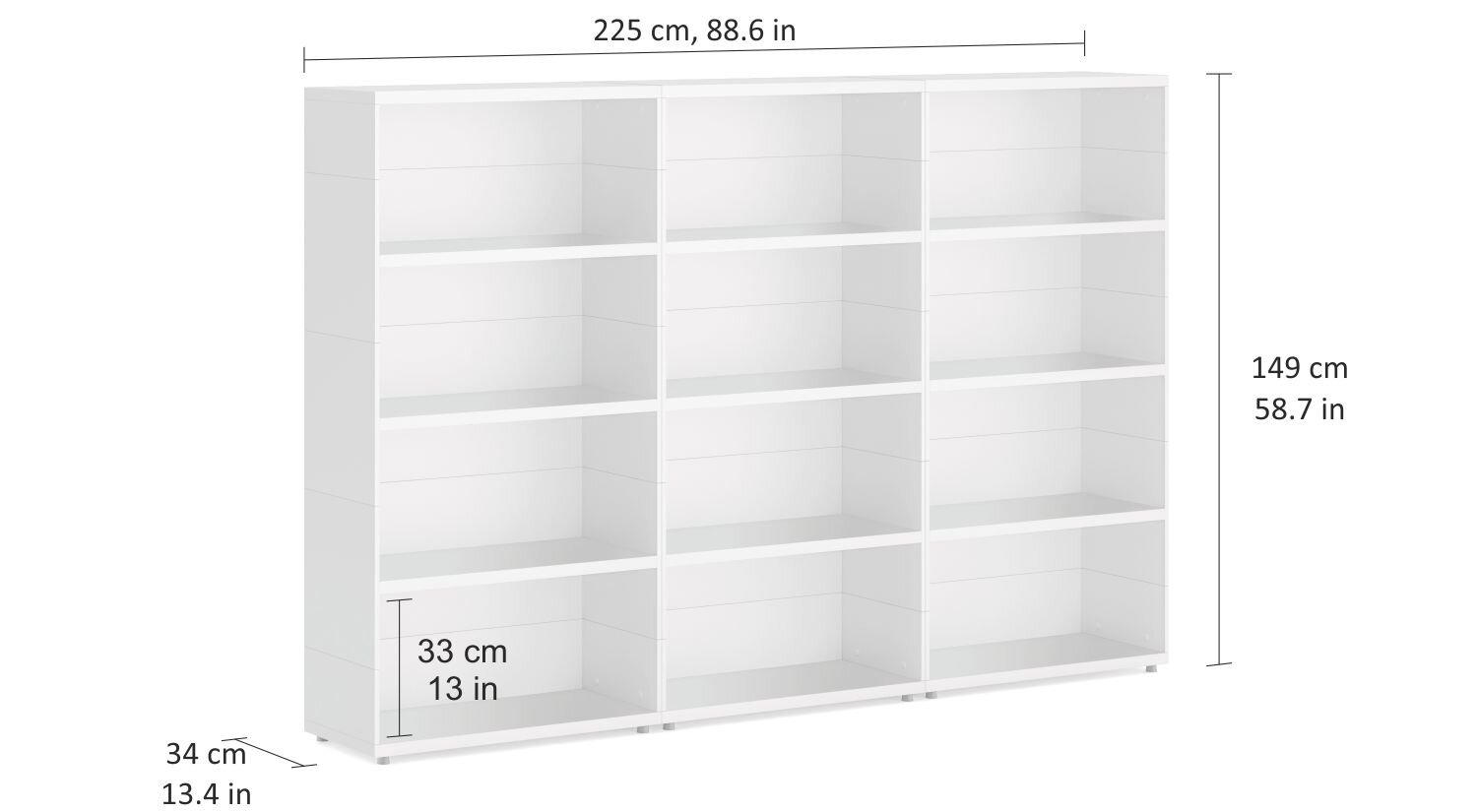 Hochwertige modulare Regalwand für Wohnzimmer, Office oder Laden mit unterschiedlichen Regalfachhöhen von 22 cm, 27 cm und 33 cm schafft Platz für CDs, Bücher und Ordner.