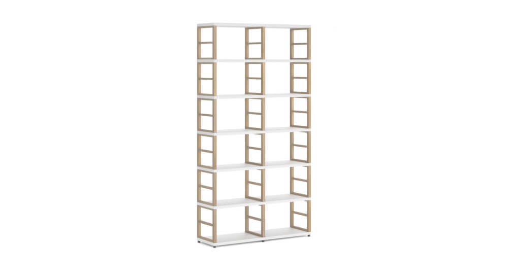 Modulares und belastbares Regalsystem mit rechteckigen Fächern und offenen Seitenrahmen. Schwere Bücher, gewichtige Ordner und schöne Deko finden hier das perfekte Zuhause.