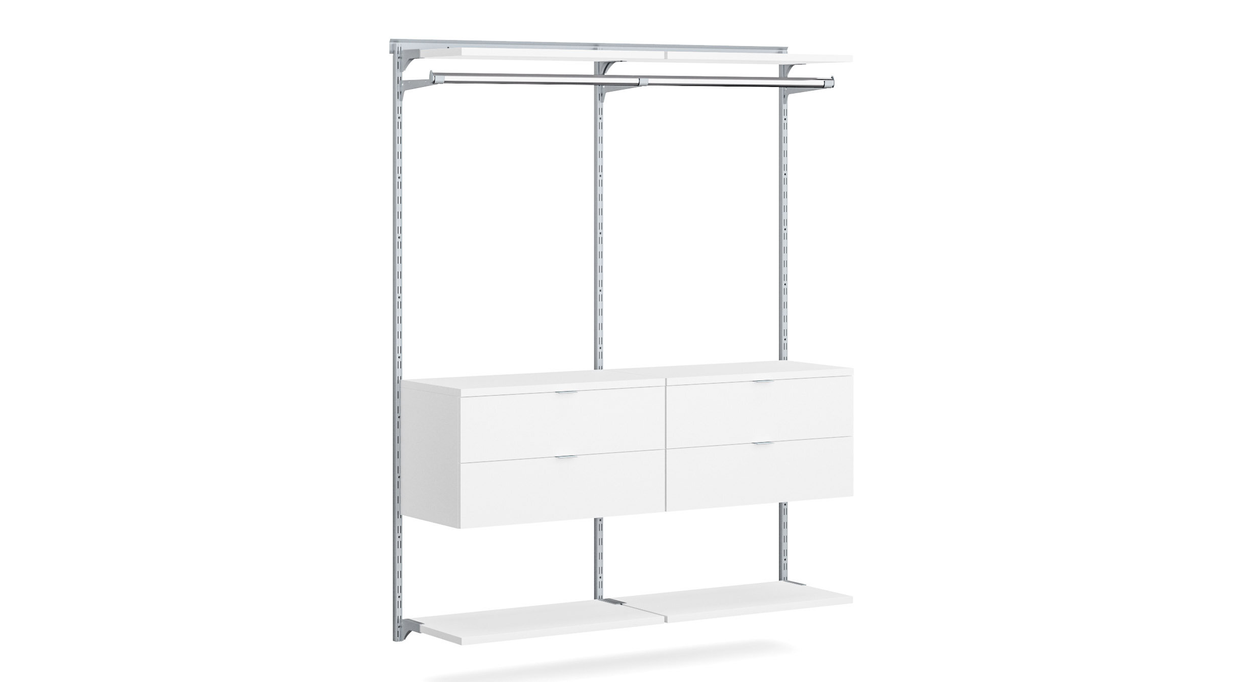 Klassisches Regalsystem für Kleiderschrank und Garderobe mit Hängeschienen + Trägern aus Stahl, Holz- oder Drahtböden, Kleiderstangen sowie Schubladen.