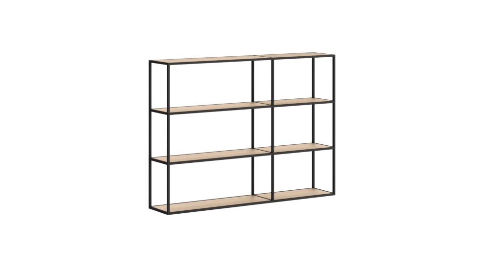 The hanging shelf impresses with its delicate frame made of black matt aluminum. For your shelf boards, you can choose between two decors with a beautiful, natural wood look you can run your fingers over – oak and black ash. The shelving system can be modularly extended in height and width. For an extra special look: forego the shelf boards altogether to create one high shelf space: Plants and other tall objects will look amazing in that frame.