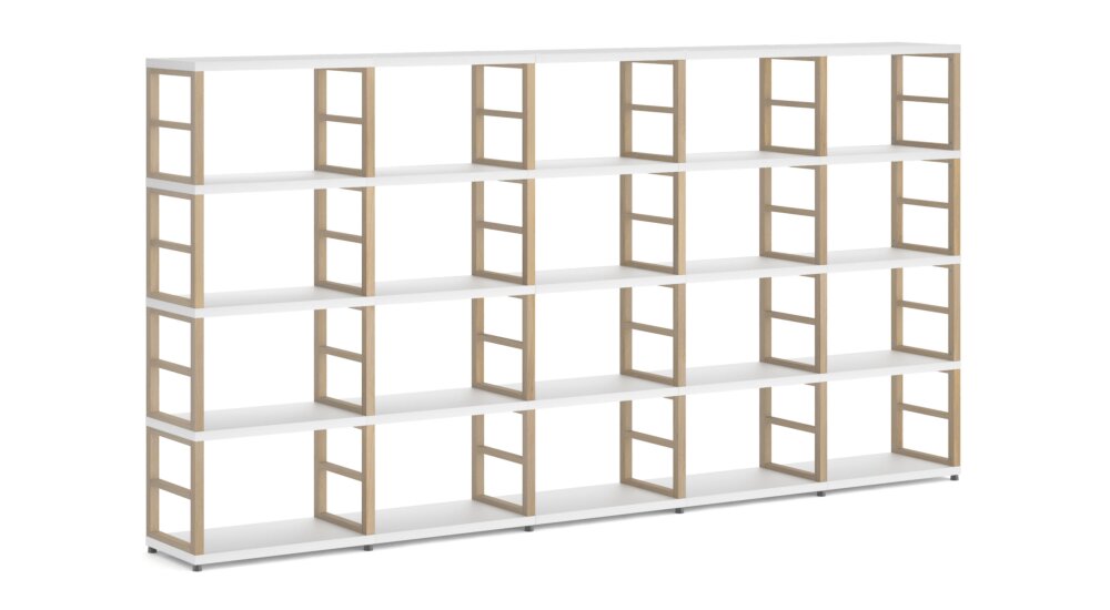 Modular, robust shelving system with rectangular shelf spaces and open side frames. Heavy books, weighty file folders and beautiful decorative objects now have their perfect space.