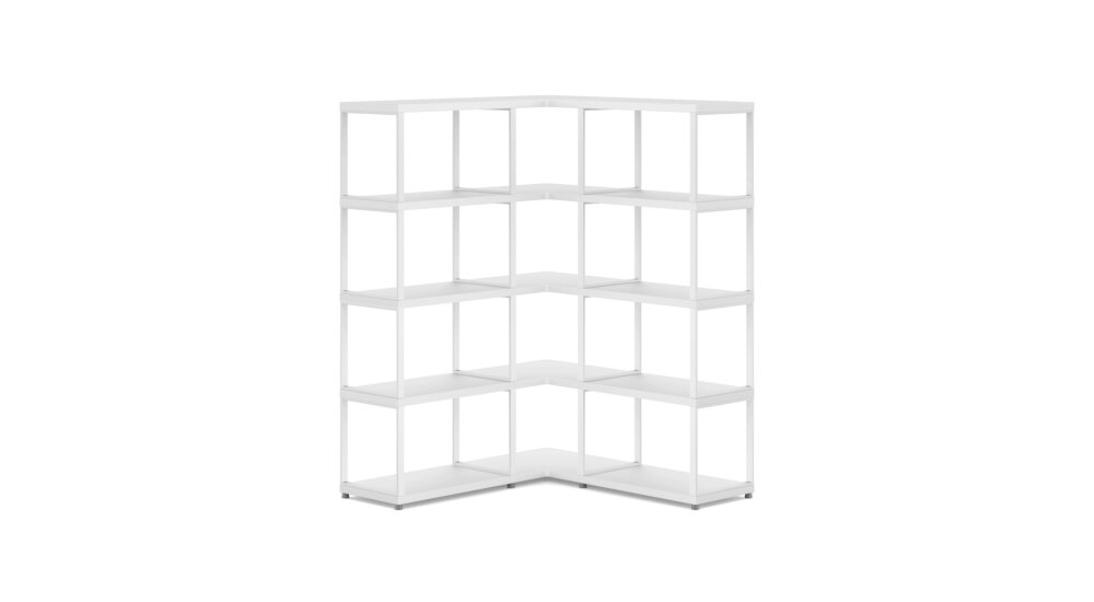 Modular corner shelving unit for your home + office with rectangular shelf spaces and side frames.