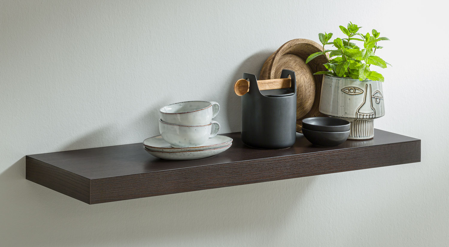 Wooden wall shelves make a home feel comfortable and warm. Light coloured wood like oak, spruce, pine or beech is typically used in Scandinavian styles. They make small rooms appear brighter and offer an authentic look. Wooden wall shelves in a darker wood type, for example walnut, embody the perfect symbiosis of elegance and warmth. How about our floating oak shelves with invisible shelf brackets – a breath of nature right there in your living space!