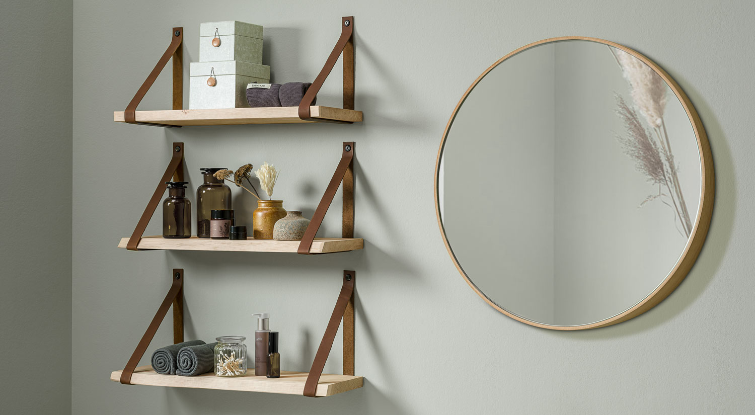 Wooden Wall Shelves - VINTAGE+LOOP Leather Strap Hanging Shelf