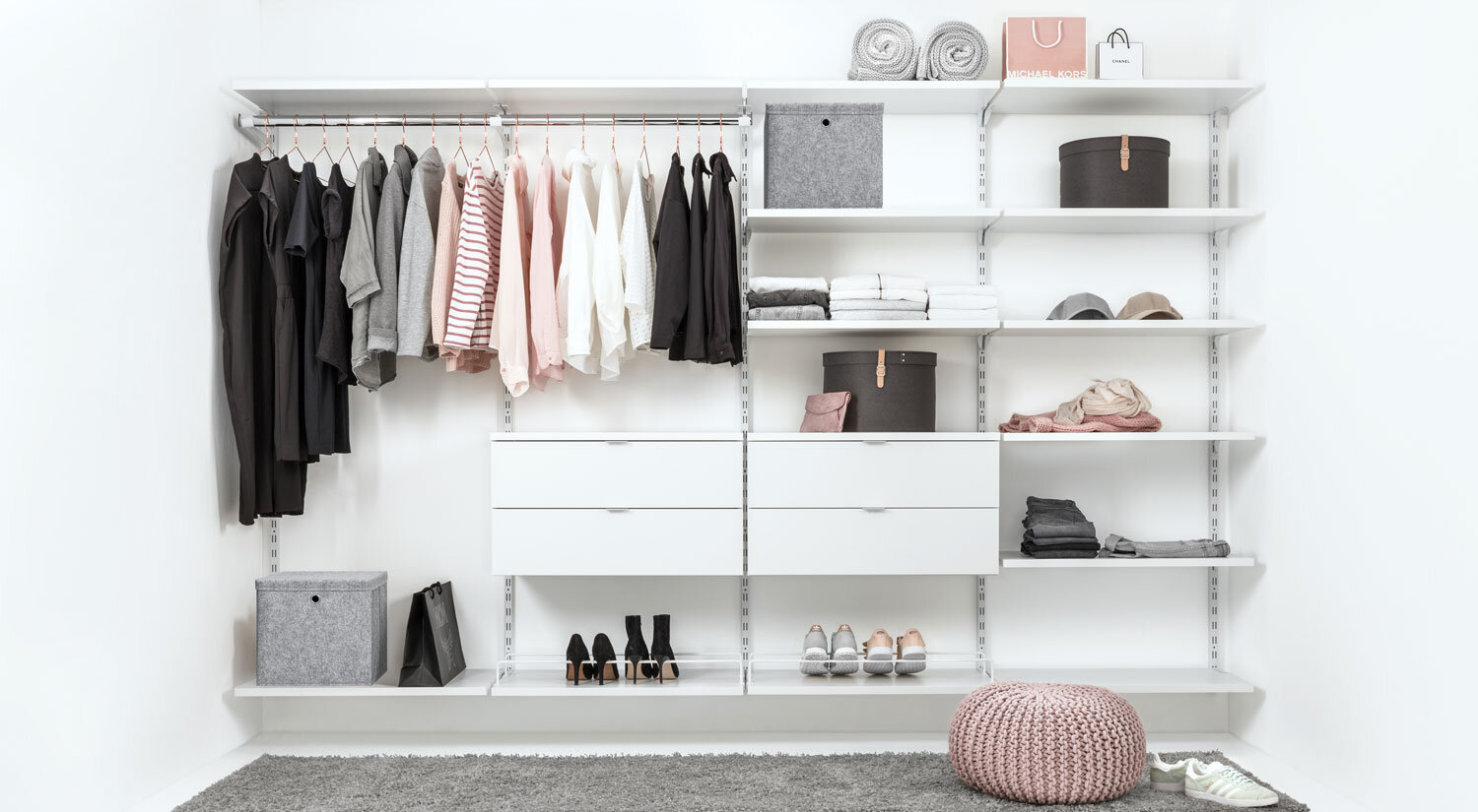 A walk-in wardrobe storage offers great flexibility in terms of storage space and brings order to your wardrobe. The traditional and most cost-effective wall shelf system with slotted rails and metal brackets is quick and easy to install. You only need to mount the horizontal hang track on the wall - after that you simply hook in the uprights and brackets then add the shelf boards - a super quick way to get a walk-in closet! And if you need a shelf with a specific height or width, you can easily create one with a perfect fit using the 3D shelf configurator. It also allows you to move around the modules you want and add or remove them as many times as you like.