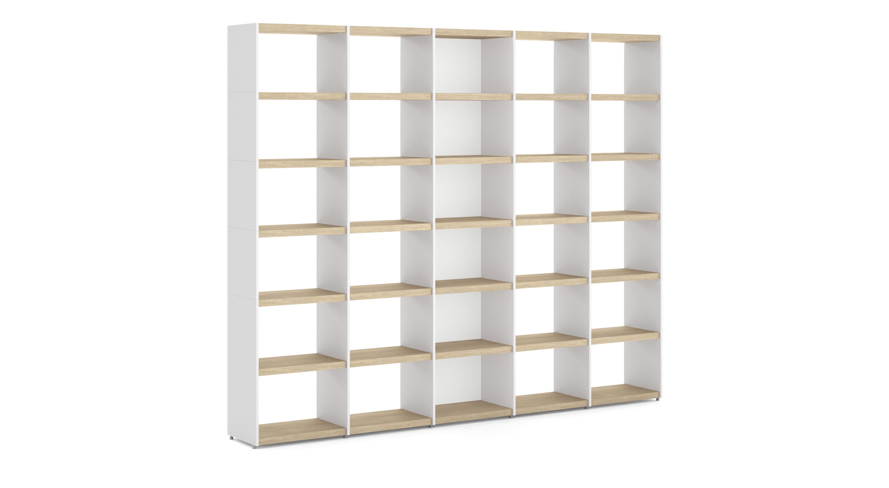 High quality modular shelving system for books, file folders and home accessories in contemporary white/oak mix with backboards in a choice of two colors.