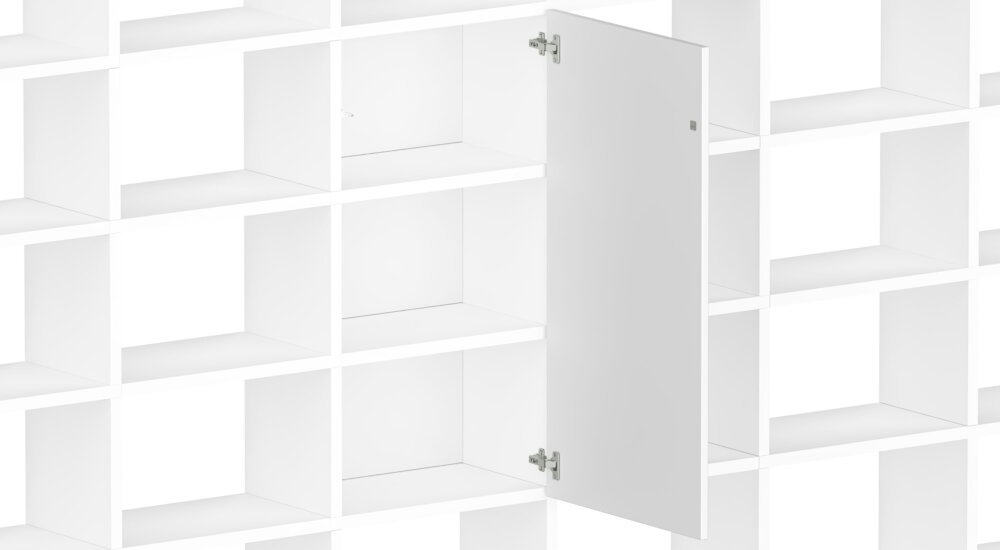 Conservez vos effets personnels derrière les spacieuses portes en applique BOON dotées de l'élégante technique push-to-open. Une légère pression suffit pour ouvrir la porte. Les compartiments ouverts et fermés créent des meubles individuels avec de la personnalité. Les portes peuvent être placées sur deux ou trois casiers, ce qui permet de créer un système de rangement entièrement fermé. Pour conserver l'aspect de l'étagère, aucun trou n'est prépercé dans les montants latéraux. Les trous pour les portes peuvent être réalisés ultérieurement à l'aide d'un gabarit de montage. Commandez selon vos préférences avec ou sans fonds.