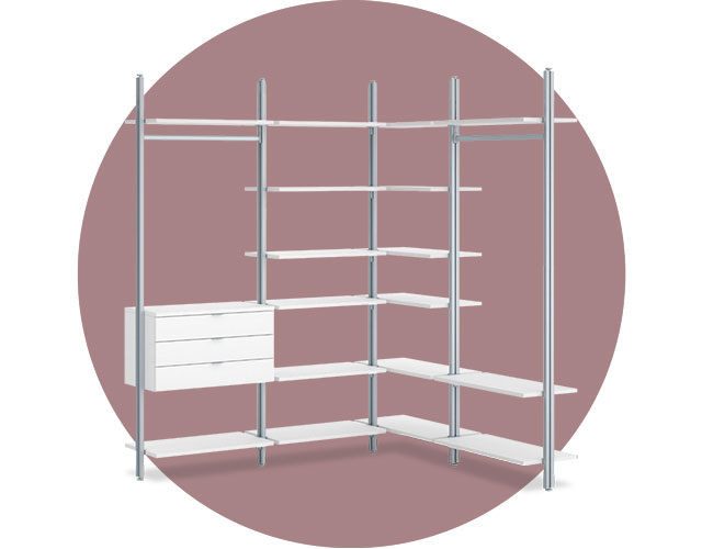 La configuration des étagères dressing CLOS-IT est rapide et simple grâce aux kits pré-configurés. Si vous le souhaitez, vous pouvez compléter les kits à tout moment avec des étagères, des tringles et des tiroirs supplémentaires. Les vis et les chevilles pour la fixation des mâts porteurs sont incluses. Voir les kits dressings