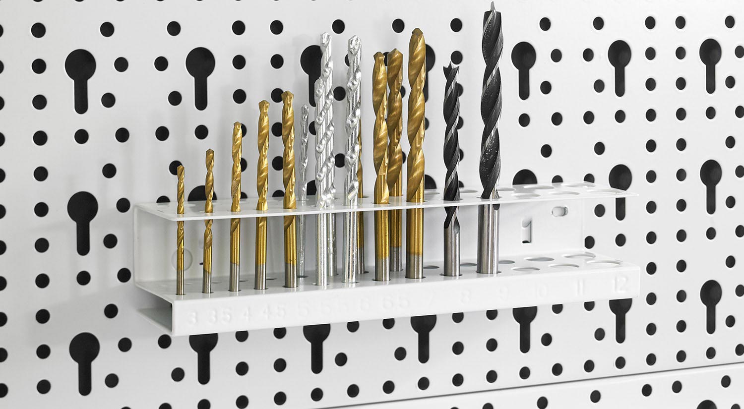 Les porte-outils en métal sont très stables et ont déjà fait maintes fois leurs preuves. Le porte-outil RACK convient particulièrement pour les tournevis. Pour le rangement de plusieurs clés à molette, nous vous recommandons le porte-outils WRENCH. Grâce au porte-outils DRILL , les forets peuvent être rangés de manière ordonnée et visible. Quant à HOLD en tôle d'acier laquée, il constitue un élément idéal pour accrocher de petits outils, tels que des marteaux et des pinceaux.