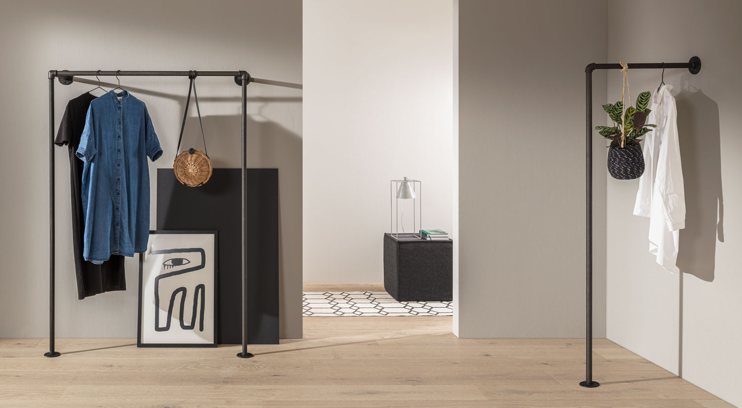 Des nombreux objets doivent trouver leur place dans un espace restreint dans l’entrée – vestes, sacs et accessoires de saison doivent être à portée de main tout en restant bien rangés. Les systèmes ouverts pour vestiaire offrent la solution idéale : les tringles permettent de suspendre les vêtements, tandis que les tablettes offrent un espace de rangement pour les habits et les objets du quotidien. Complétés par des crochets pratiques pour les écharpes ou les sacs, ils créent un ensemble harmonieux qui facilite la vie quotidienne. Grâce à sa conception ouverte, le hall d’entrée paraît lumineux et accueillant – parfait pour les petits espaces ou les couloirs étroits.