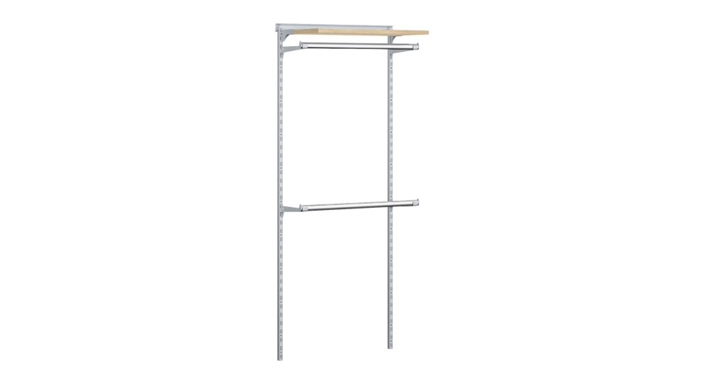 Étagère modulable classique pour le rangement des vêtements avec des rails de suspension + fixations en acier, tablettes bois aggloméré ou étagères filaires et tringles penderie.