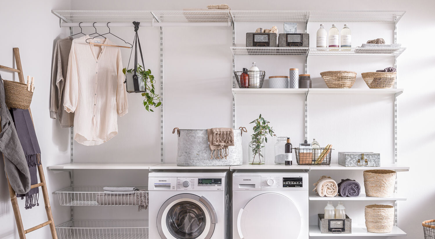 Voordelig en tijdloos wandrailsysteem voor voorraadkast, kelder, wasruimte, studentenkamer en winkelinrichting met wandrails + planksteunen van staal.