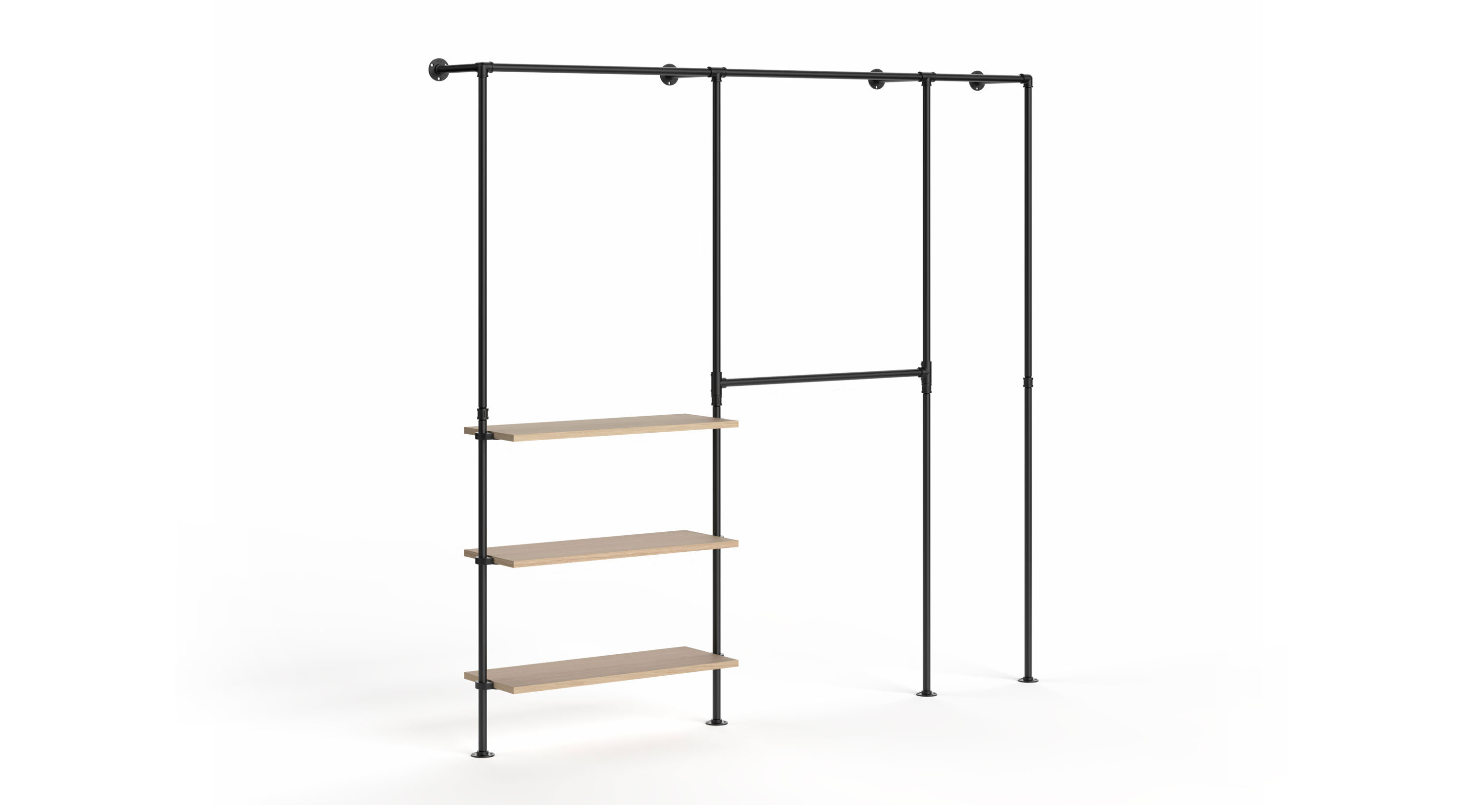 Met PIPE bergt u uw kleding overzichtelijk en altijd binnen handbereik op. Het modulaire systeem is bijzonder robuust en dankzij de hippe loftstijl uniek. Of u het nu vrijstaand of aan de wand monteert – PIPE biedt flexibele toepassingsmogelijkheden en hoge stabiliteit. De echt houtfineer legplanken zorgen voor een natuurlijke uitstraling en vormen het perfecte contrast met het stedelijke loftdesign – met extra ruimte voor schoenen, tassen en accessoires.