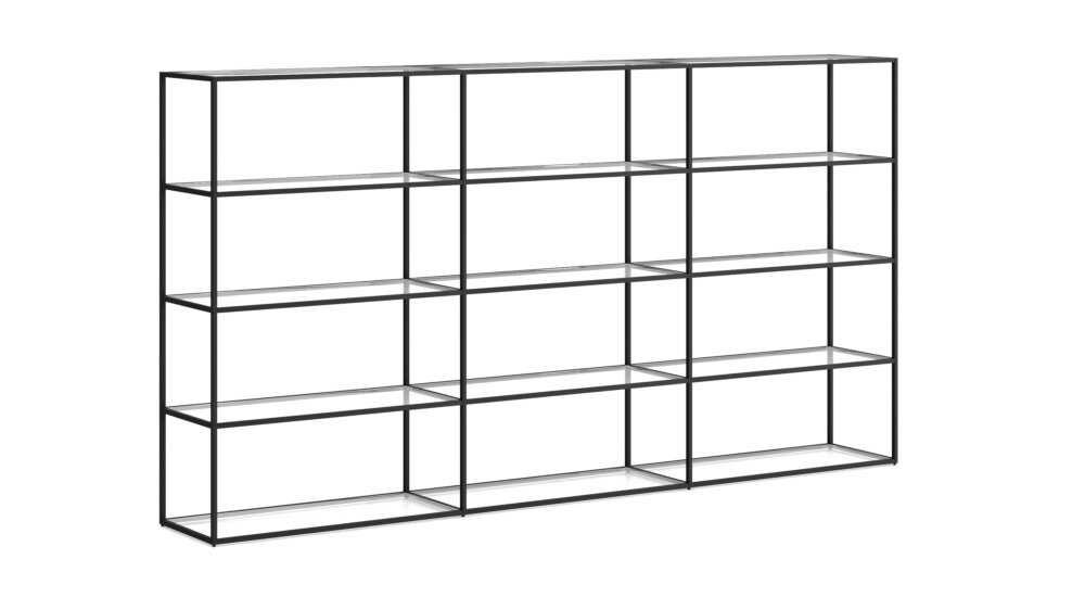 The emphasis here is on the slender frame made of matt black aluminium. For your shelf boards, you can choose between beautiful, natural wood looks you can run your fingers over – or our more starkly modern glass shelf boards. The shelving system can be modularly extended in height and width. For an extra special look: forego the shelf boards altogether to create one high shelf space: Plants and other tall objects will look amazing in that frame.