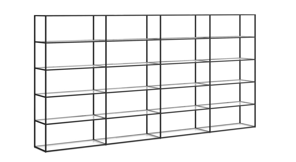 The emphasis here is on the slender frame made of matt black aluminium. For your shelf boards, you can choose between beautiful, natural wood looks you can run your fingers over – or our more starkly modern glass shelf boards. The shelving system can be modularly extended in height and width. For an extra special look: forego the shelf boards altogether to create one high shelf space: Plants and other tall objects will look amazing in that frame.