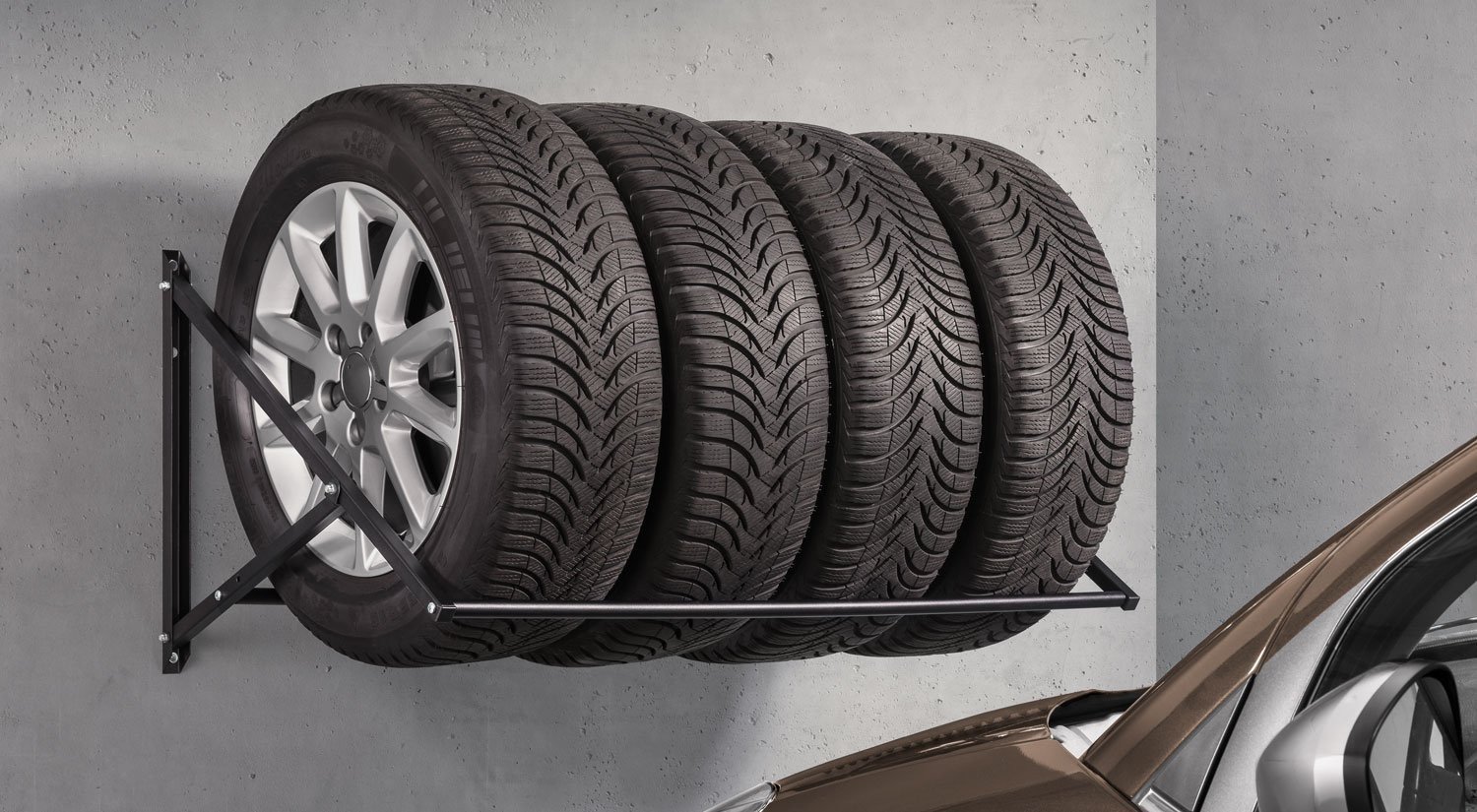 Our is the perfect product for storing your summer or winter tires, while creating additional storage space in your garage, basement or workshop. The wall shelf can hold very heavy loads, which means you can stack four tires on the without a problem on the wall in your garage.