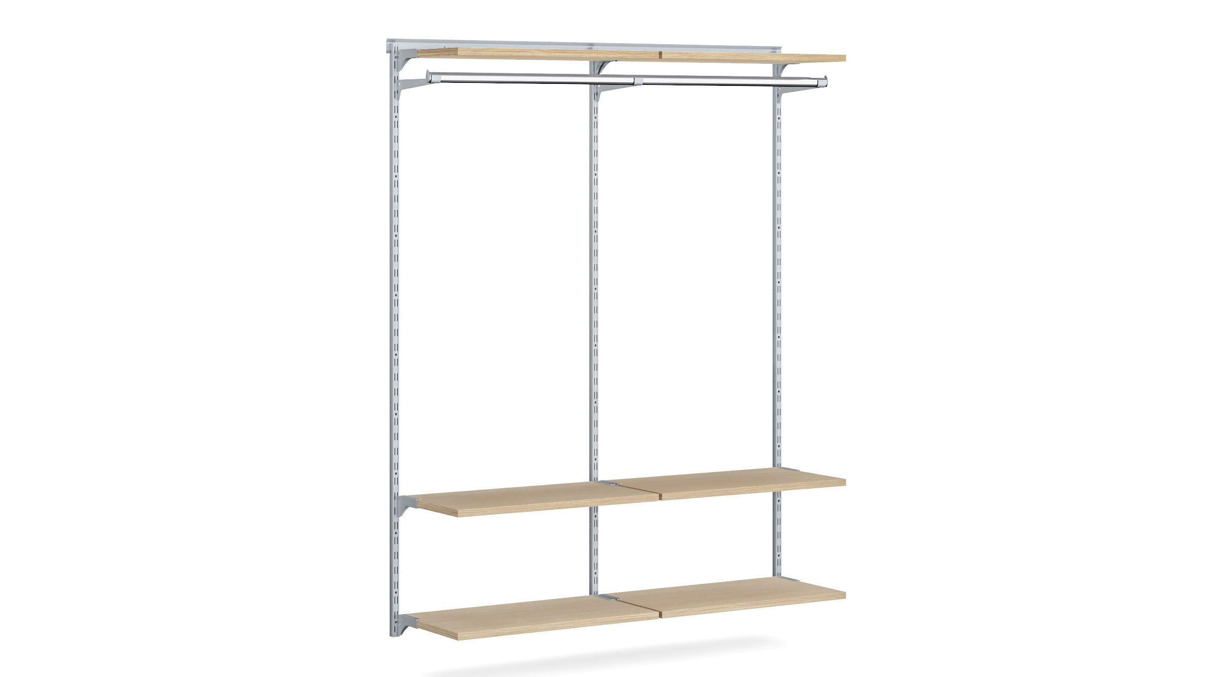 You want to design an open wardrobe? Look no further: the WALK-IN wardrobe organiser is just what you are looking for. The system is easy and quick to put together: The horizontal track needs to be attached to the wall. Then you hook in the upright rails and add shelf boards. The result is a shelf that matches your needs perfectly. And if you need a shelf with a specific height or width, you can easily create one with a perfect fit using the 3D shelf configurator. It also allows you to move around the modules you want and add or remove them as many times as you like.
