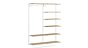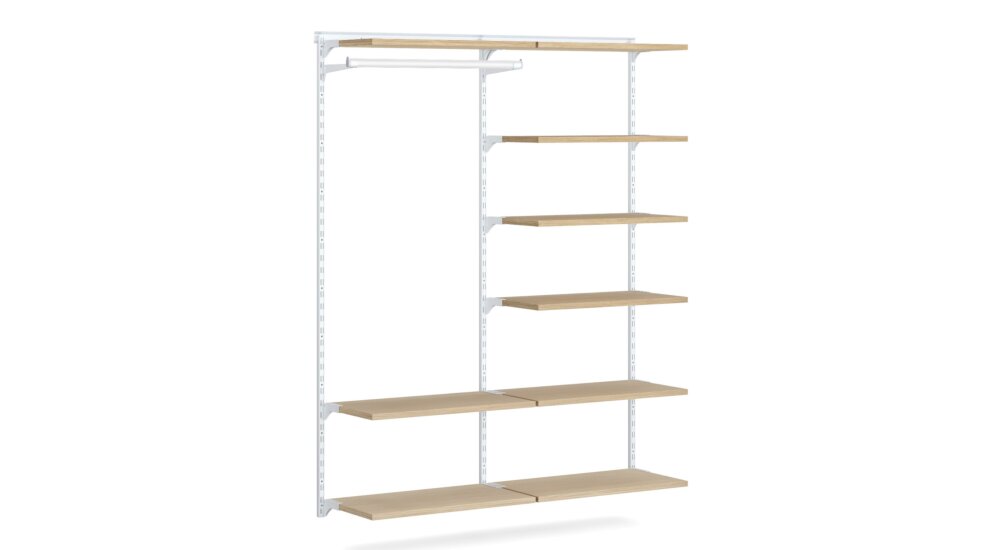 You want to design an open wardrobe? Look no further: the WALK-IN wardrobe organiser is just what you are looking for. The system is easy and quick to put together: The horizontal track needs to be attached to the wall. Then you hook in the upright rails and add shelf boards. The result is a shelf that matches your needs perfectly. And if you need a shelf with a specific height or width, you can easily create one with a perfect fit using the 3D shelf configurator. It also allows you to move around the modules you want and add or remove them as many times as you like.