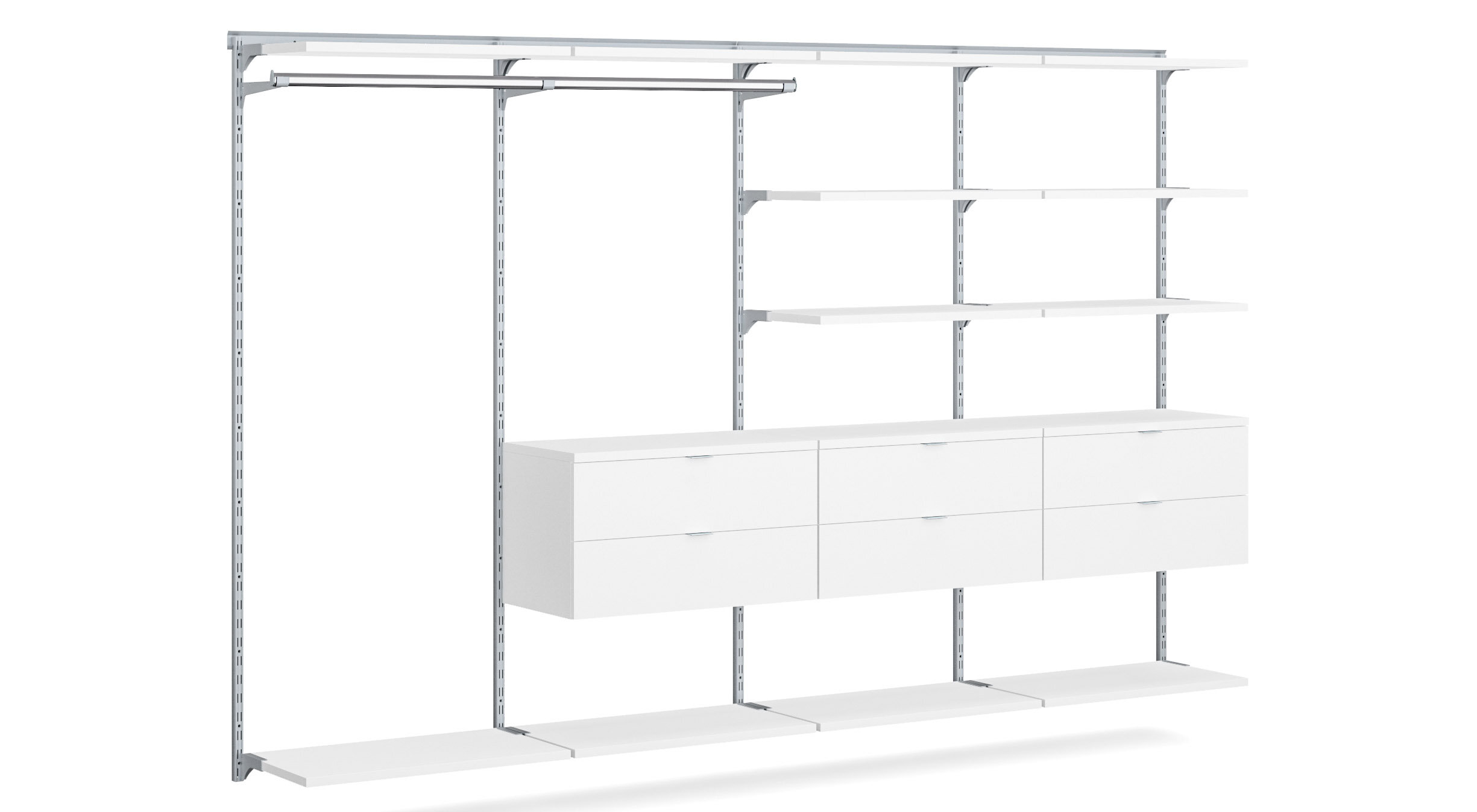 A walk-in wardrobe storage offers great flexibility in terms of storage space and brings order to your wardrobe. The traditional and most cost-effective wall shelf system with slotted rails and metal brackets is quick and easy to install. You only need to mount the horizontal hang track on the wall - after that you simply hook in the uprights and brackets then add the shelf boards - a super quick way to get a walk-in closet! And if you need a shelf with a specific height or width, you can easily create one with a perfect fit using the 3D shelf configurator. It also allows you to move around the modules you want and add or remove them as many times as you like.